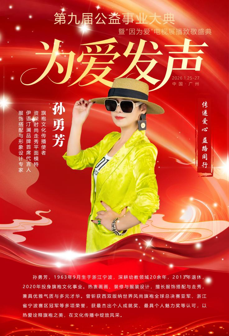 孙勇芳,1963年9月生于浙江宁波,深耕幼教领域20余年,2013年退休,2020年投身旗袍文化事业。热衷画画、装修与服装设计,擅长服饰搭配与走秀,兼具优雅气质与多元才华。曾斩获西双版纳世界风尚旗袍全球总决赛亚军、浙江省宁波赛区冠军等多项荣誉,获最杰出个人成就奖、最具个人魅力奖等认可,以热爱诠释旗袍之美,在文化传播中绽放风采。