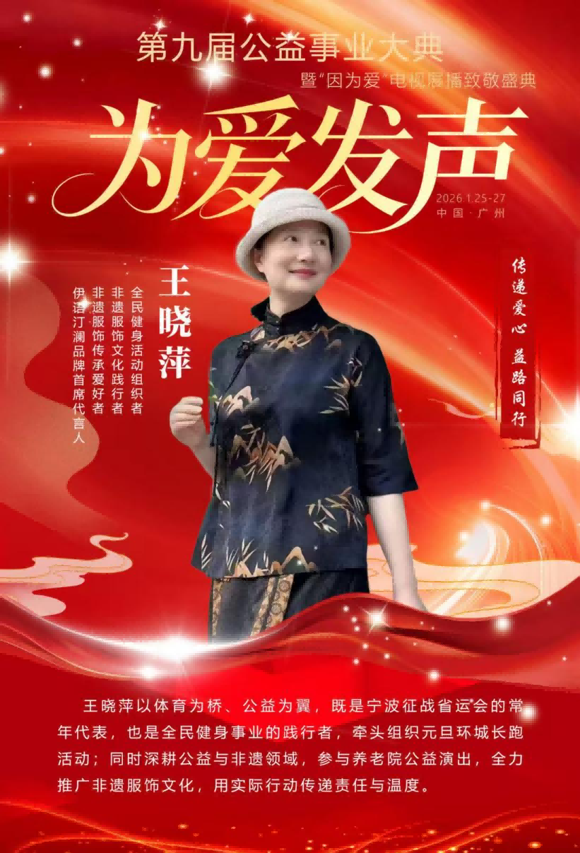 王晓萍以体育为桥,公益为翼,既是宁波征战省运动会的常年代表,野生全民健身事业的践行者,牵头组织元旦环城长跑活动,同时深耕公益与非遗领域,参与养老院公益演出,全力推广非遗服饰文化,用实际行动传递责任与温度。