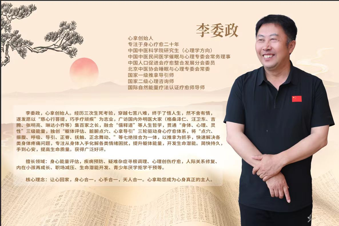 为探寻更全面的疗愈之法,李委政系统研习东西方躯体心理学,走遍大江南北遍访名医大家,博采中医经络脏腑理论与西方躯体治疗的精髓。在多年的实修实证中,他独创“躯体评估,脏腑点穴,心拿导引”三轮驱动身心疗愈体系,将推拿技法与呼吸导引、舞动疗愈相融合,从躯体入手,疏通经络气机,化解潜藏情绪,疗愈过往创伤,唤醒生命本自具足的修复潜能。