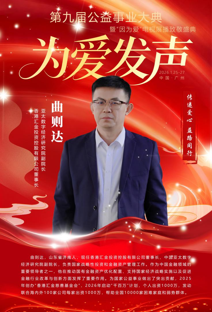 金融的温度,藏在服务民生的点滴之中;发展的意义,在于让更多人共享时代红利。在深耕金融主业、助力国家发展的同时,曲则达始终心系公益,将社会责任融入发展理念,用金融力量为公益事业赋能。2025年,他牵头创办“香港汇金慈善基金会”,搭建起金融与公益联动的专业平台,让慈善行动更具制度化、可持续性;2026年,他再度发力,启动公益帮扶“千百万”计划,以个人出资1000万的表率之举,凝聚海内外100家企业的公益力量,号召每家企业出资1000万,形成亿元公益帮扶资金,精准助力全国10000家困难家庭和弱势群体。这一计划以清晰的目标、扎实的举措,成为金融助力第三次分配、推动共同富裕的生动实践,让金融活水真正润泽民生土壤,为困境家庭点亮生活希望。