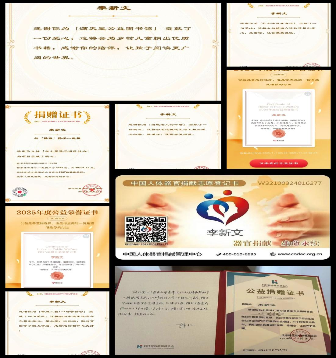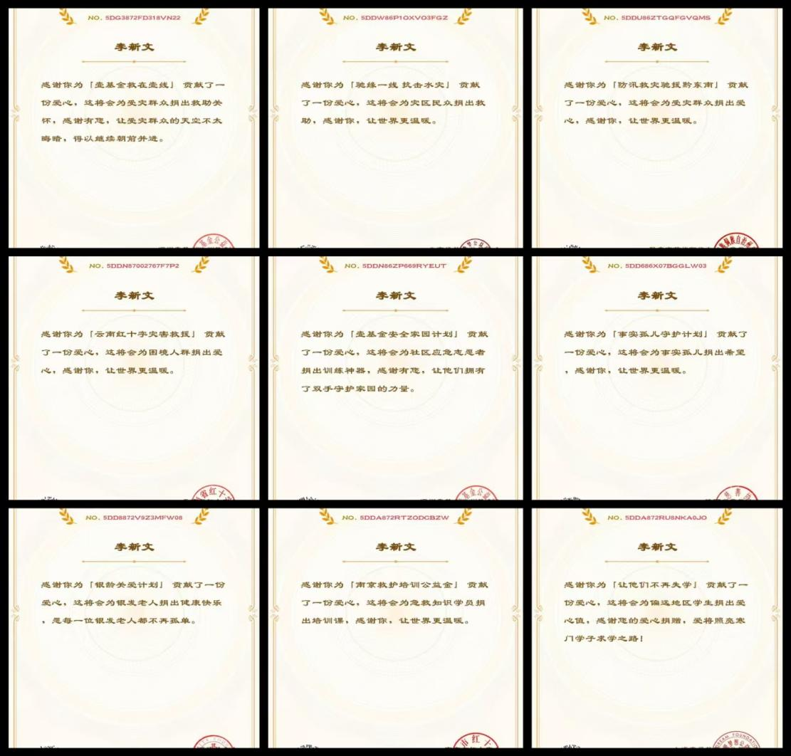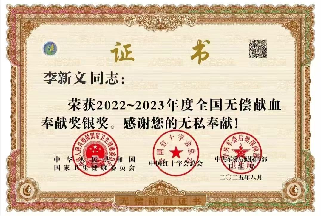 危难时刻显担当,急难险重冲在前。在重大公共事件与灾害救援中,李新文始终挺身而出,用责任与担当筑牢安全防线。2022年疫情防控关键时期,他主动请缨加入志愿者队伍,坚守抗疫一线长达三个月,不分昼夜开展防控值守、物资配送、政策宣传等工作,用坚守与奉献守护群众生命健康安全,先后荣获扬州市邗江区汉河街道办“抗疫先锋奖”、深圳市“战役英雄”等多项抗疫荣誉。在洪水等自然灾害救援中,他始终第一时间响应号召,主动为灾区捐款捐物,全力支援灾区抢险救灾与群众安置工作,获得中华慈善总会“紧急驰援抗洪救灾贡献爱心”官方认证,并通过多家公益机构持续助力灾区重建,帮助受灾群众早日重返家园。除此之外,他坚持无偿献血多年,累计献血30次以上,用汩汩热血传递生命希望,荣获2022-2023年度“全国无偿献血奉献奖银奖”这一国家级荣誉。