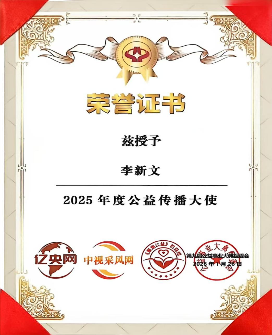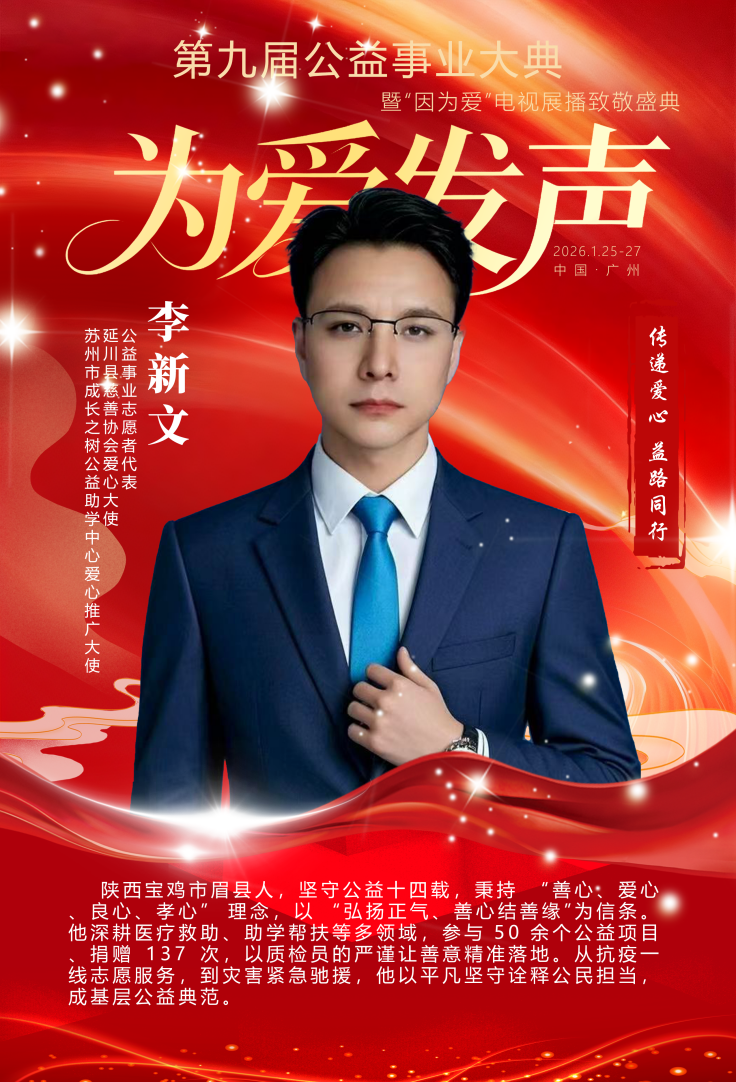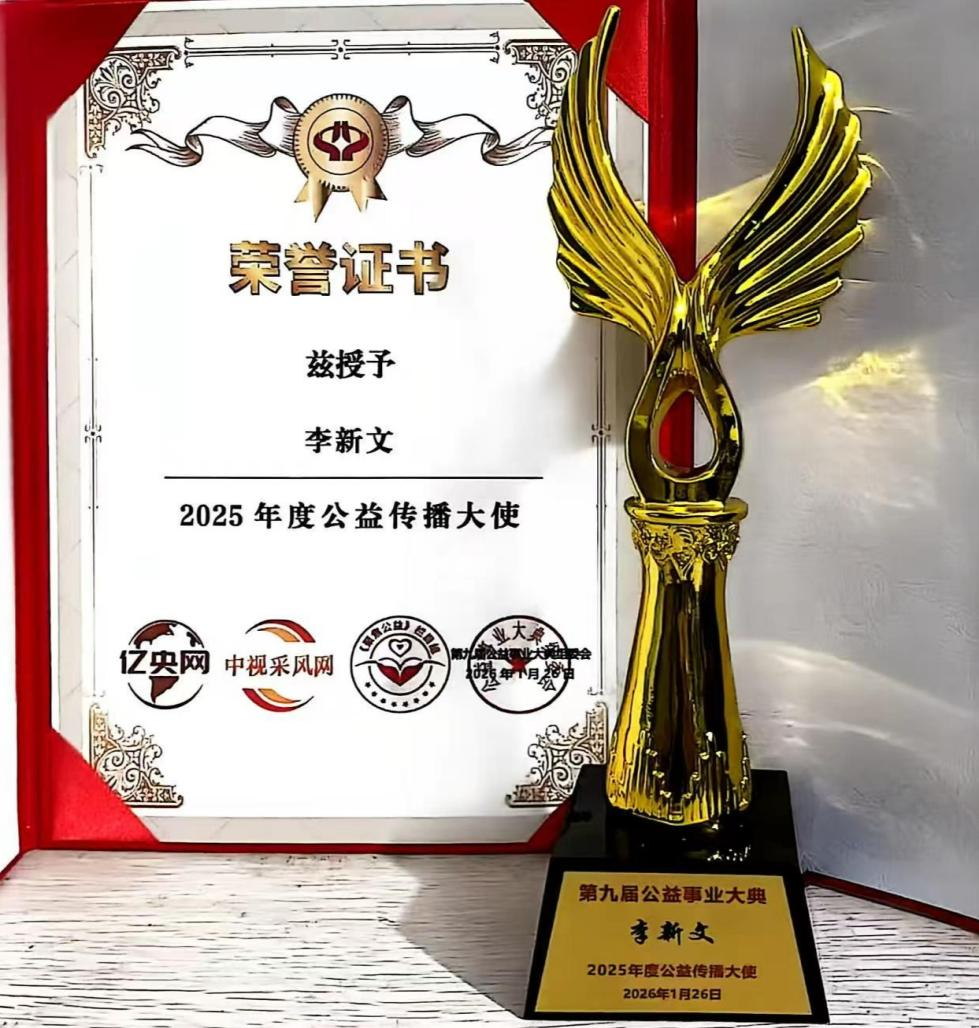凝聚公益力量,传承公益薪火。2026年1月26日,第九届公益事业大典在广州凤凰城圆满落幕。企业基层工作者李新文受邀出席这一公益盛事,凭借笃行不怠、善心永驻,为基层公益事业赋能添力;用14年的坚守诠释了“公益不是一时之举,而是一生之诺”,荣膺2025“年度公益传播大使奖”。