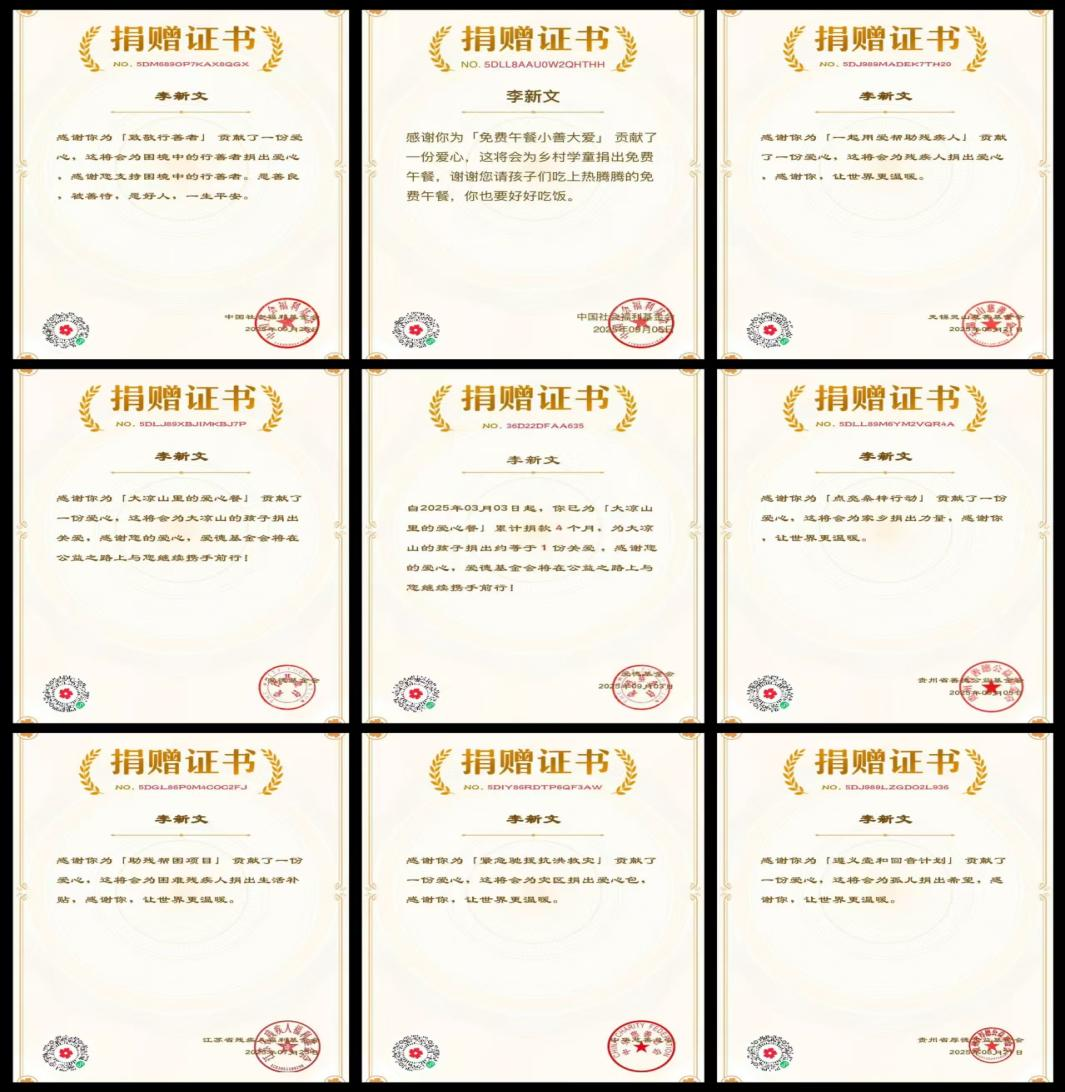 十四载公益路,李新文的善举既具广度又有深度,捐赠足迹覆盖教育助学、残疾人关爱、地方公益事业等多个场景,通过腾讯公益等平台持续深耕,形成了“长期化、精准化、多元化”的公益践行模式。工作之余,他还常主动走进孤儿院、敬老院,用耐心的陪伴、真诚的关怀,温暖每一位弱势群体成员的心。