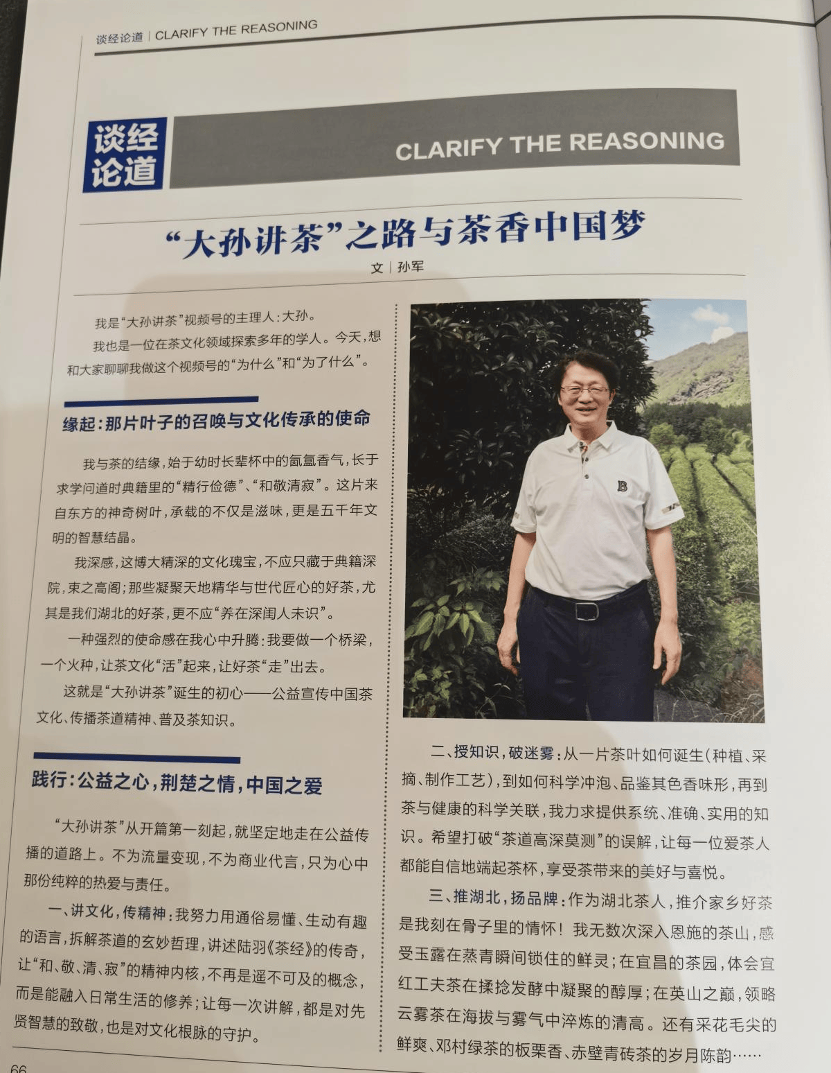 专业领域的卓越成就,并未让孙军停下前行的脚步。在他心中,始终怀揣着对传统文化的赤诚热爱,以及对社会大众的责任担当。当目光聚焦到中国茶文化传承与湖北茶产业发展的痛点难点时,他毅然开启了公益传播的新征程。身兼湖北省政协农业和农村委员会咨政专家、湖北省茶叶协会副会长,多地及多家企业茶产业发展专家顾问,武汉大学等多所高校客座教授等多重身份的他,主动整合自身的资源优势、专业优势与影响力,于五年前创办“大孙讲茶”公益视频号,自此踏上了义务传播茶文化、助力茶产业的公益之路,这一走,便是五年风雨兼程、初心不改。