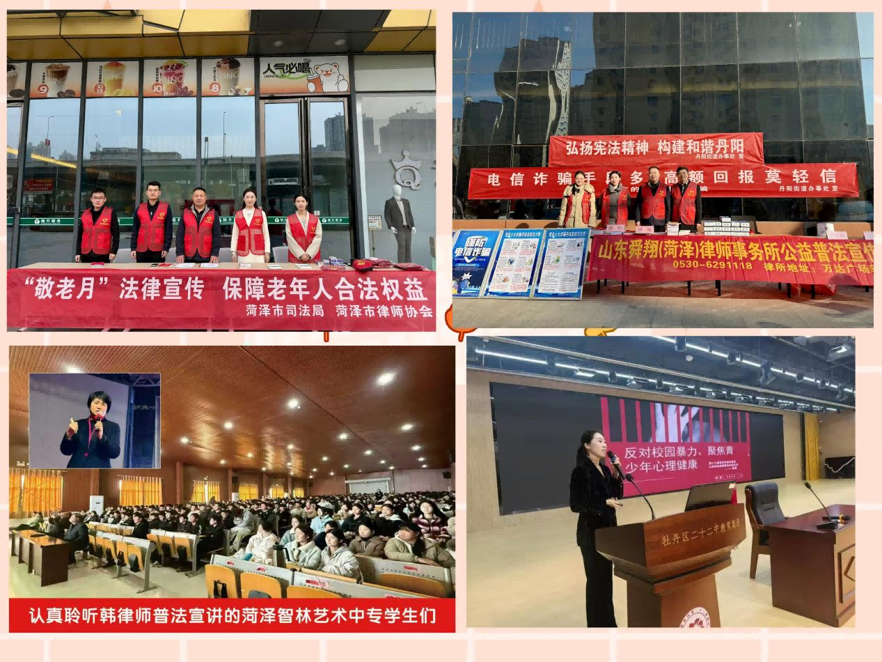 多年来,韩光玲坚持走进社区、学校、军营和企事业单位,开展婚姻家庭、青少年法治、反家庭暴力等主题的公益普法讲座,累计达数百场;团队成员分工配合,将讲座内容整理成通俗易懂的图文资料,方便受众后续学习。作为牡丹晚报《红尘心语》情感栏目的常年法律顾问,韩光玲十年间每周撰写 “律师视点” 点评文章,累计发表五百余篇,从法律和情感角度为读者提供建议;团队核心成员参与文章的专业审核,确保内容准确易懂。在未成年人保护和妇女儿童维权方面,韩光玲作为山东省 “未成年人法律援助专家律师库” 成员、菏泽市妇联 “爱心伞” 妇儿维权志愿服务团副团长,多次提供法律援助、参与涉法涉诉信访案件调解;团队则成立专项小组,负责案件对接、材料整理等工作,为弱势群体提供切实的法律支持。本届公益大典上,韩光玲及团队荣获 “2025 年度公益传播大使” 称号,这是对他们多年来坚持法律公益的认可。