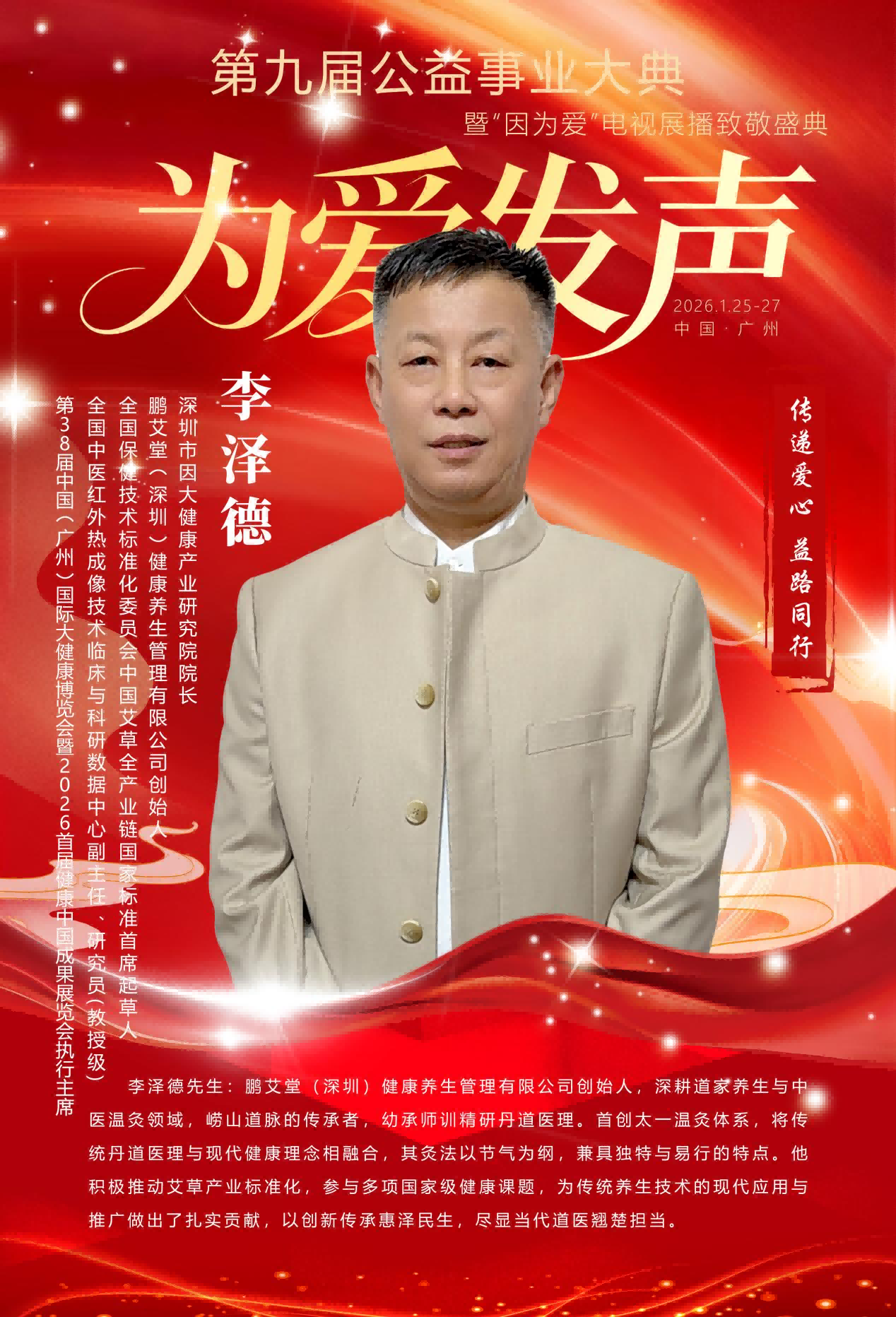 先生之志,不止于个人修持,更在道医传承与民生福祉。他牵头“糖尿病”等六类“红灸食音”医养国家课题,将“治未病”思想落到临床实处;打造“无限叠加循环培训体系”,让道医之术走出师门,广惠天下。同时,先生积极投身行业建设,任全国保健技术标准化委员会中国艾草全产业链国家标准首席起草人、全国中医红外热成像技术临床与科研数据中心副主任、研究员(教授级)、深圳市因大健康产业研究院院长、第38届中国(广州)国际大健康博览会暨2026首届健康中国成果展览会执行主席等职,以道家“齐物”思想规范艾草产业,用“无为而无不为”智慧梳理全产业链标准,推动艾草从田间到终端的升级。作为鹏艾堂(深圳)健康养生管理有限公司创始人,他融合道医智慧与现代科技,为大健康产业发展贡献力量。