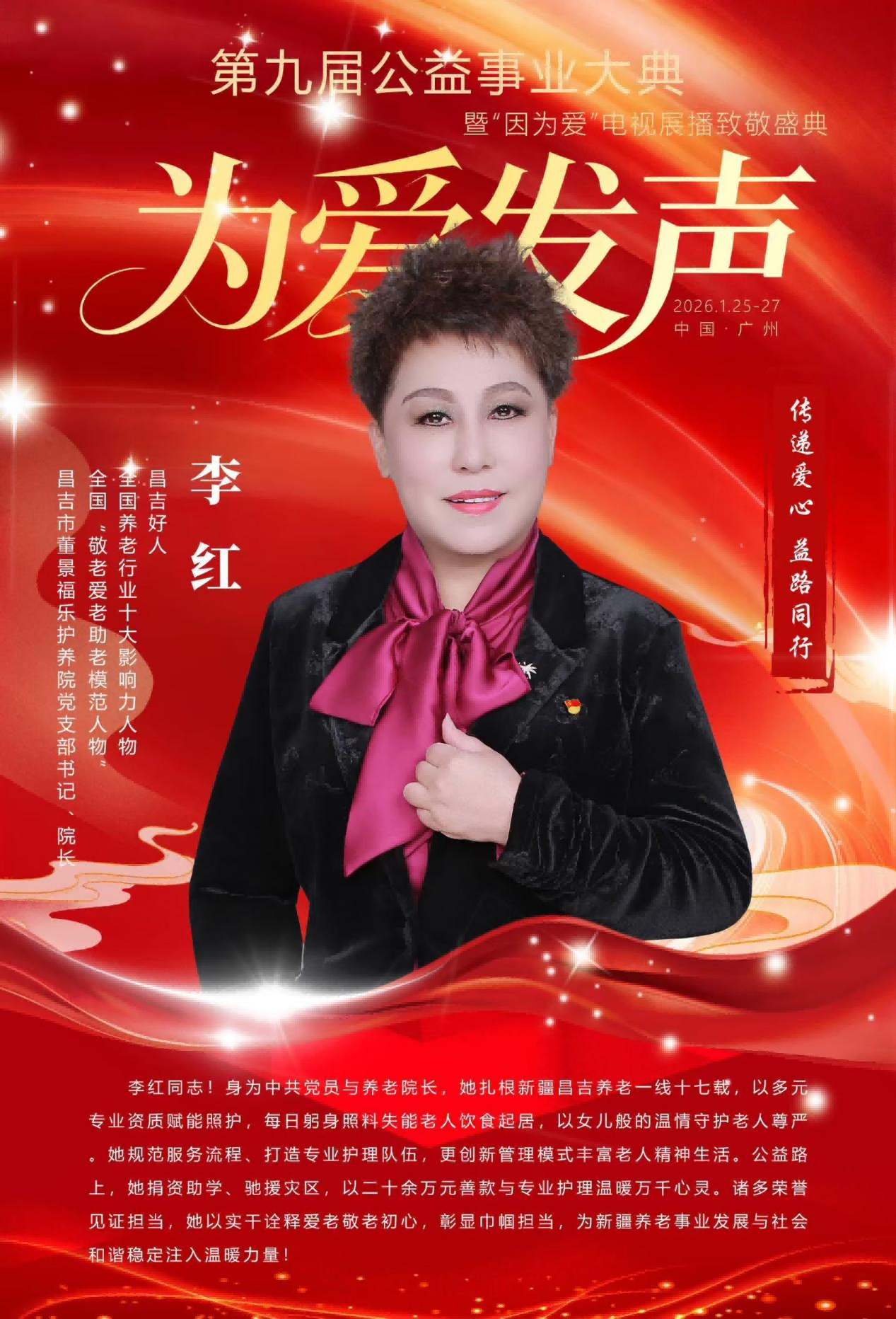 从昌吉州“十大感动人物”到“最美新疆人”,从全国“抗疫卫士”到自治区“天山孺子牛奖”,一项项荣誉的背后,是李红对养老事业的执着坚守,是对公益初心的始终践行。作为一名回族党员,她在边疆大地上用爱心消融隔阂、用奉献凝聚力量,不仅推动了昌吉市乃至新疆养老事业的规范发展,更为社会和谐稳定注入了温暖动能。未来,这位心怀大爱的巾帼先锋,必将继续在敬老与公益的道路上砥砺前行,书写更多温暖人心的篇章。
