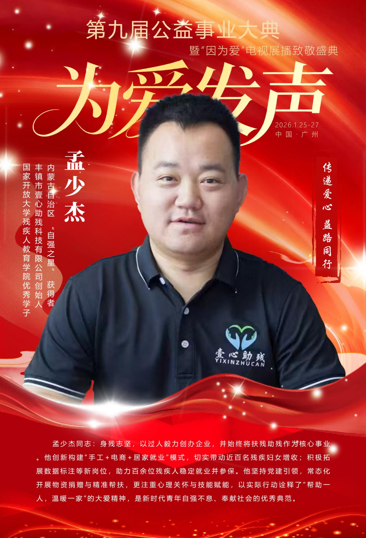 多年来,孟少杰带领企业累计服务残疾群体数百人次,用脚步丈量责任,用爱心传递温暖。他以自身经历证明,残缺的身躯亦可承载厚重的担当,平凡的坚守能绽放不凡的光芒。未来,他将继续坚守助残初心,拓展公益边界,让扶残助残的美德代代传承,让更多残疾群体在关爱与尊重中实现人生价值。