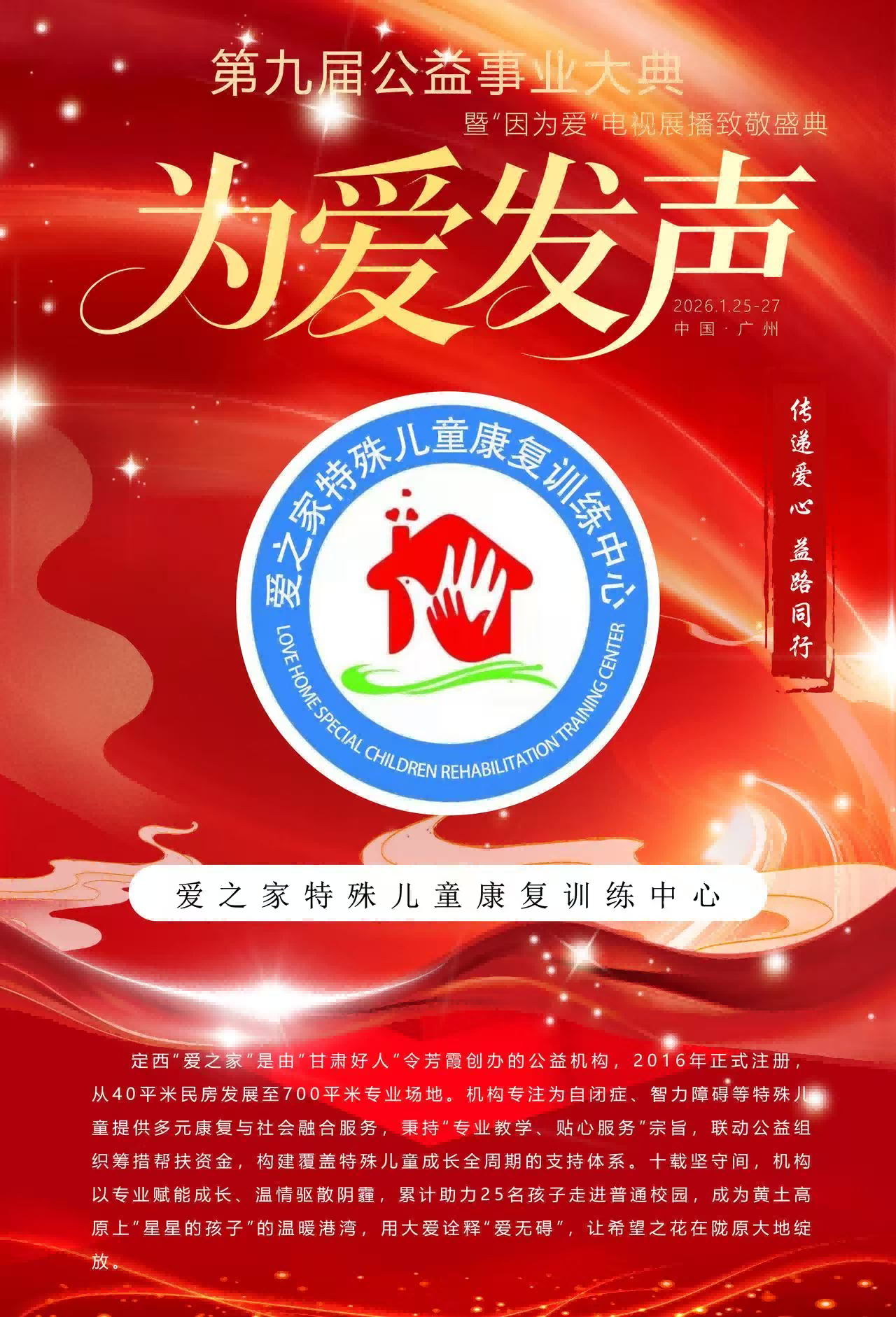 定西市安定区爱之家特殊儿童康复训练中心主任令芳霞受邀出席第九届公益事业大典,凭借在特殊儿童康复教育公益领域的突出实践与贡献,获评”2025年度公益爱心使者”;现场她接受央视主持人专访并发表主旨演讲,以“星青年妈妈”、40余名特殊儿童的“令妈妈”双重身份,分享了深耕特殊儿童康复公益的初心与实践。